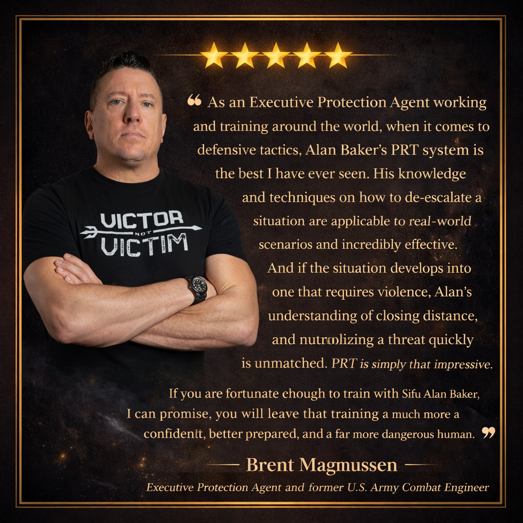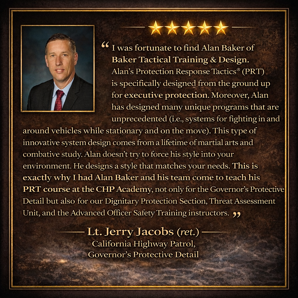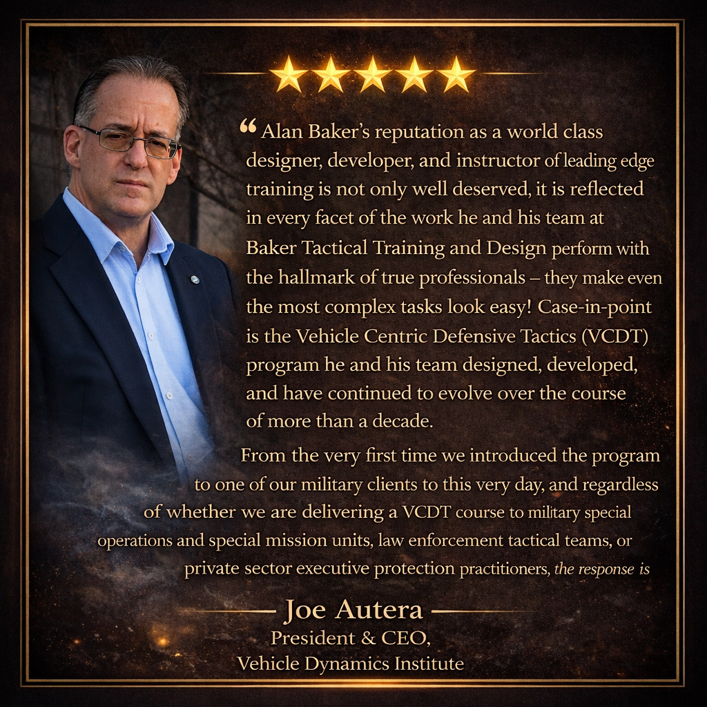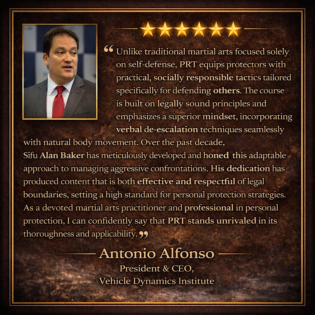 Sifu Baker is a certified Personal Protection Specialist and the Defensive Tactics Instructor for The Executive Protection Institute in Clarke County, Virginia. Alan also teaches a specialized defensive tactics program, called Vehicle Centric Defensive Tactics, for the Vehicle Dynamics Institute in New Jersey. VDI & EPI are considered the top schools for teaching Executive Protection (Bodyguards) and tactical / security driving globally.