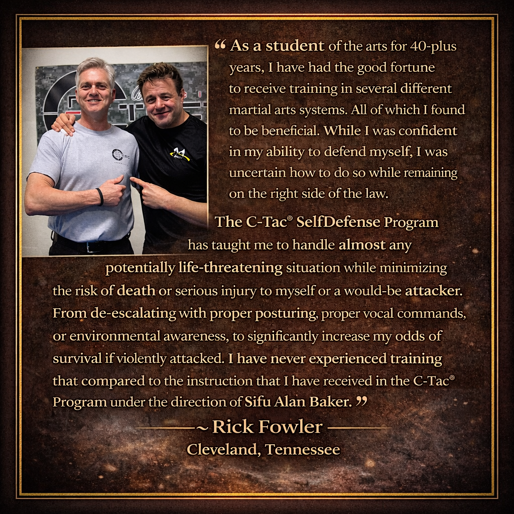 C-Tac teaches a simple truth: in the real world, anything you can get your hands on can become a tool, including the environment around you. Fighting is an art of war, and that mindset matters. Over the years, many martial arts drifted away from that reality. C-Tac brings it back by teaching you how to think, move, position, and problem-solve when the situation is not clean and the threat is not fair.