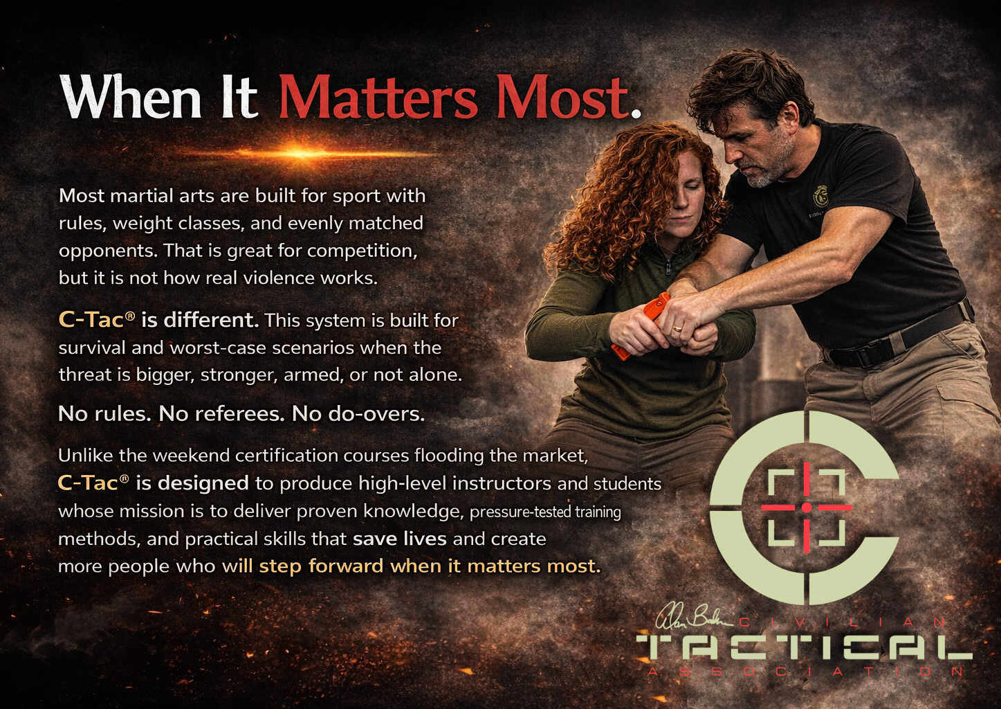 The combatives industry is crowded with feel-good, low-value training that hands out paper after a single weekend. C-Tac is not that program if you are looking for an in-depth skill-building study, join us.